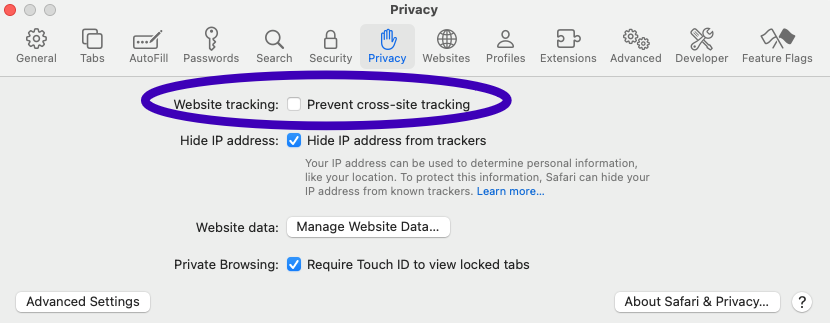 - In Safari's Settings, under Privacy, make sure Prevent cross-site tracking is not checked.